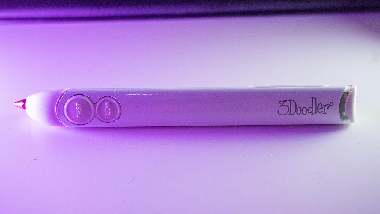 To run, all you need to do is plug the power chord into the wall to get the pen up and running. There are two settings on the pen itself depending on the type of plastic you’re using. PLA and ABS/FLEX. The difference is the temperature the pen runs at giving a chance to melt the plastic before running it out the nozzle. There’s a slow and fast speed setting right where your thumb would sit if held like a traditional pen. Stick to slow at first. Trust me. If you want to get the plastic out if you’re finished with a particular colour, a double click of the button will stick it in reverse and push the plastic out the top.