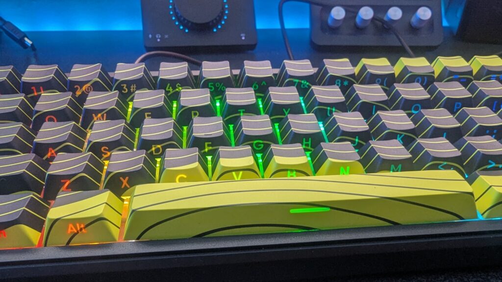 One thing I did want to shout out about the design of the X65 PRO HE is the fact that straight on the keycaps look fontless right? Well, I was ready to slam it for that very reason. I’m a fan of being able to see which key is which. I know, I’m getting old. Anyway, once I plugged the keyboard into my PC I realised this wasn’t the case at all and the typeface is on the side of each key because the RGB effects activated, and that shines through the keycaps to reveal the font. So I just wanted to point that out because I thought it looked really eye-catching. The wave pattern looks really cool, comes in a red or yellow colour scheme and the keycaps are shine-through PBT by the way, and they’ve undergone a five-sided inverse sublimation process to lengthen their life.