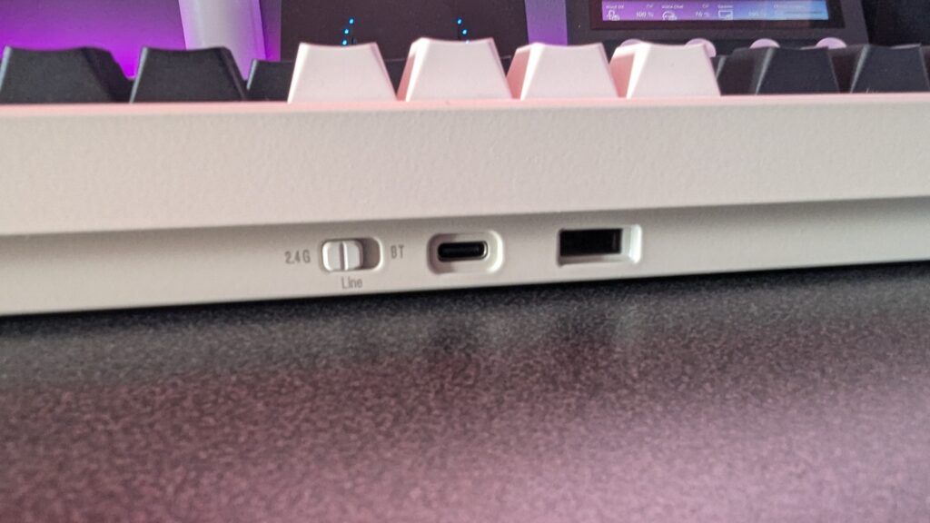 This one here is the grey colour scheme with off white body and black and white keys, and around back you can find a USB type C input as well as a wireless dongle for 2.4GHz connections and Bluetooth. It’s a great keyboard for both typing and gaming and is incredibly budget-friendly thourhg the Attack Shark website or Amazon.