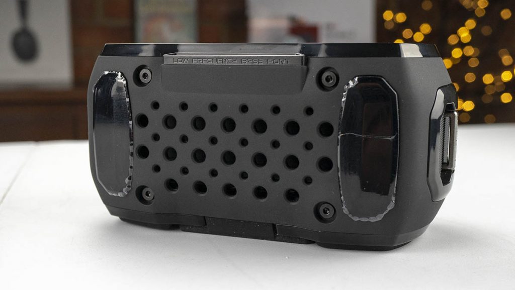 The speaker itself is pretty rubbery. By that I mean it’s covered in rubber, pretty much all of the way round minus the speaker grill and some small metal areas on top. It gives the speaker the upmost protection from the elements and even things like drops and bangs. Don’t worry too much if this does fall of the side of your table, or you drop it when taking it to the beach. The important areas are covered with a large rubber door, to stop water from getting in if it goes go for a swim.