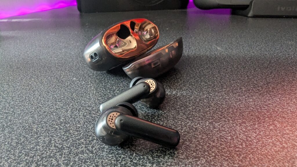 But one area that I am not keen on at all with the Ace 2 is the inner lining of the charging case which is this metallic bronze type colour. Now I know it’s to match the outside of the case giving off the hints of orange, but here it just feels a little too blingy. The inside of the standard Ace earbuds is much nicer and to be honest with you between the two designs, I do prefer that of the opaque black style of the Ace, though realistically there’s not a huge difference between the two, and to be honest I don’t really think the gold/bronze inner housing and see-through translucent grey casing makes it look the more premium offering that it is.