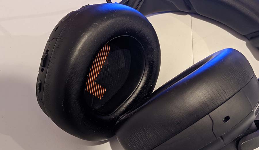 There are some subtle RGB LED effects that can be turned on or off, and appear in two different places. The first is driectly around the logos on each earcup, which look as if the RGB panels are covered in mesh. The second snakes in a jagged pattern around the logo, which again, feels very much on brand, and give off a nice subtle effect. There’s nothing goudy about the JBL Quantum One gaming headset, and everything is nice and tasteful, and primarily all black.