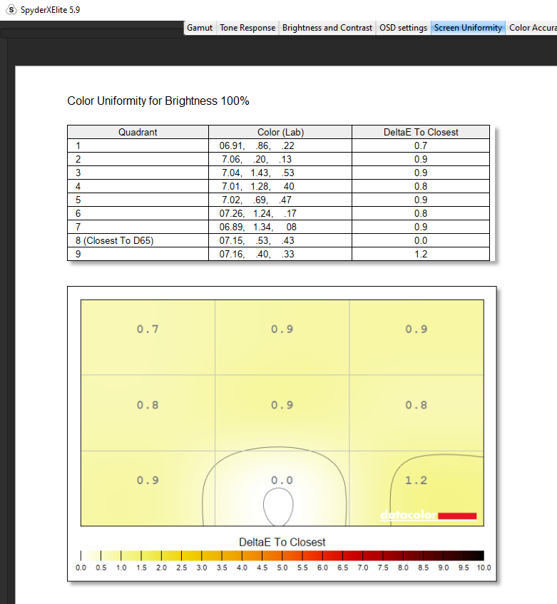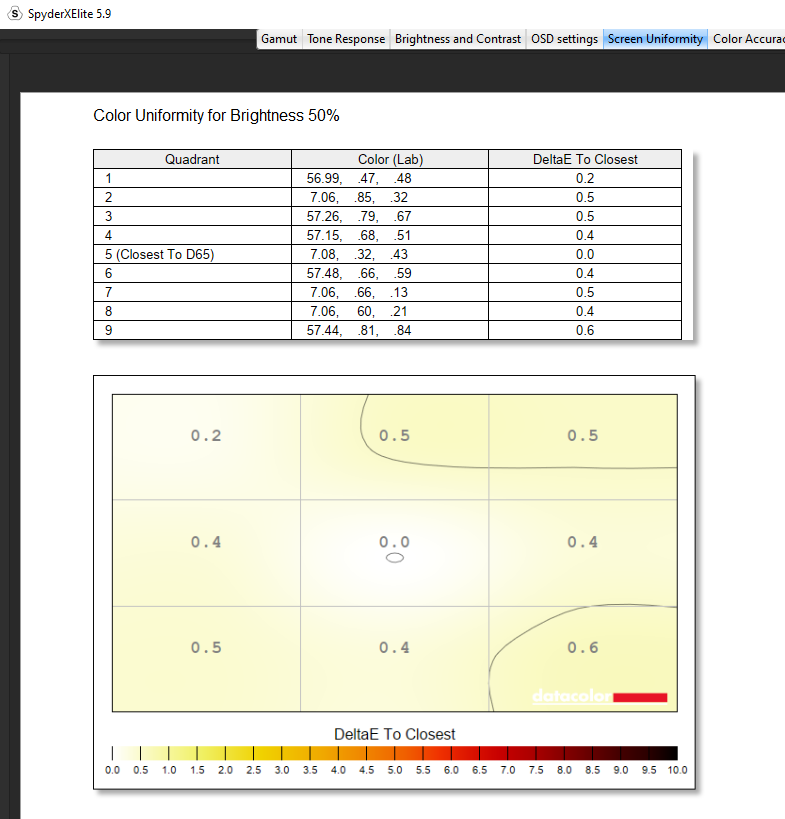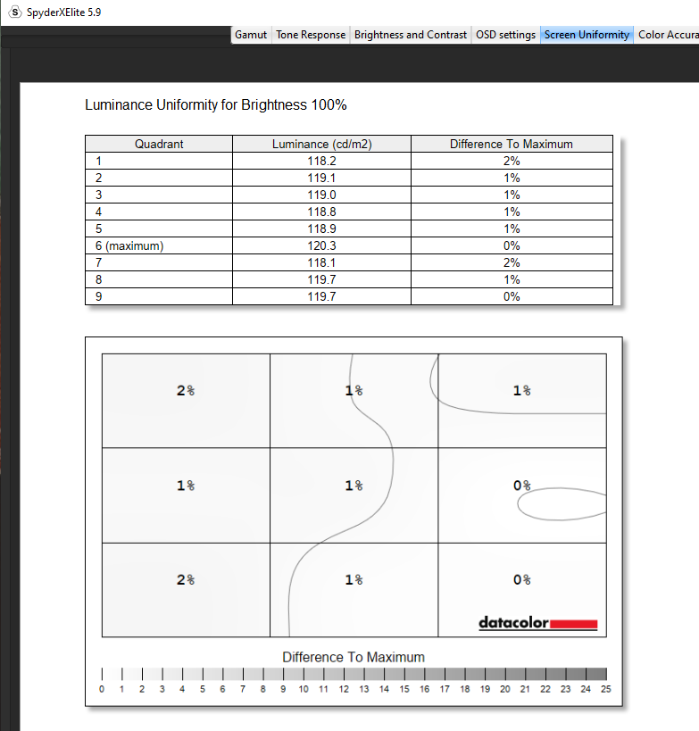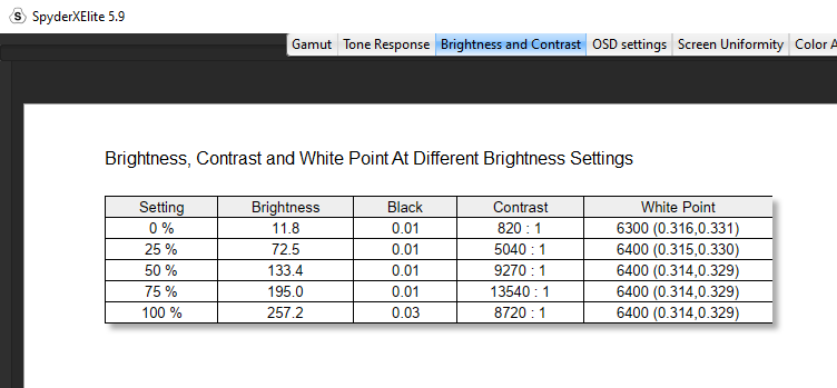 For its brightness and contrast, the EVNIA achieved a contrast ratio of 8,720:1 at 100% brightness. However, knock this brightness down to 75% and we saw a contrast ratio of 13,540:1 which was astounding. The white point sat at 6,400 which again was great to see and colour uniformity was super balanced across the entire panel at 50% brightness, with I suppose its dark spot hitting in the bottom right corner at 0.6 but oh no, what a shame that is. Look, there’s literally nothing wrong with this score at all and even at 100% brightness, there was still nothing really to comment on except maybe an outlier in the bottom middle, but nothing again shocking at all. Luminance uniformity was pretty much dead on again, with I suppose a bit of imbalance on the left-hand side of the panel at a 50% brightness, but again these numbers thrown back are nothing to be concerned about. Did we just win the panel lottery? Of course, this could be just this panel proving great, but it’s what I’ve got to comment on, and saying this, I mean my sentiment still stands. Wow.
