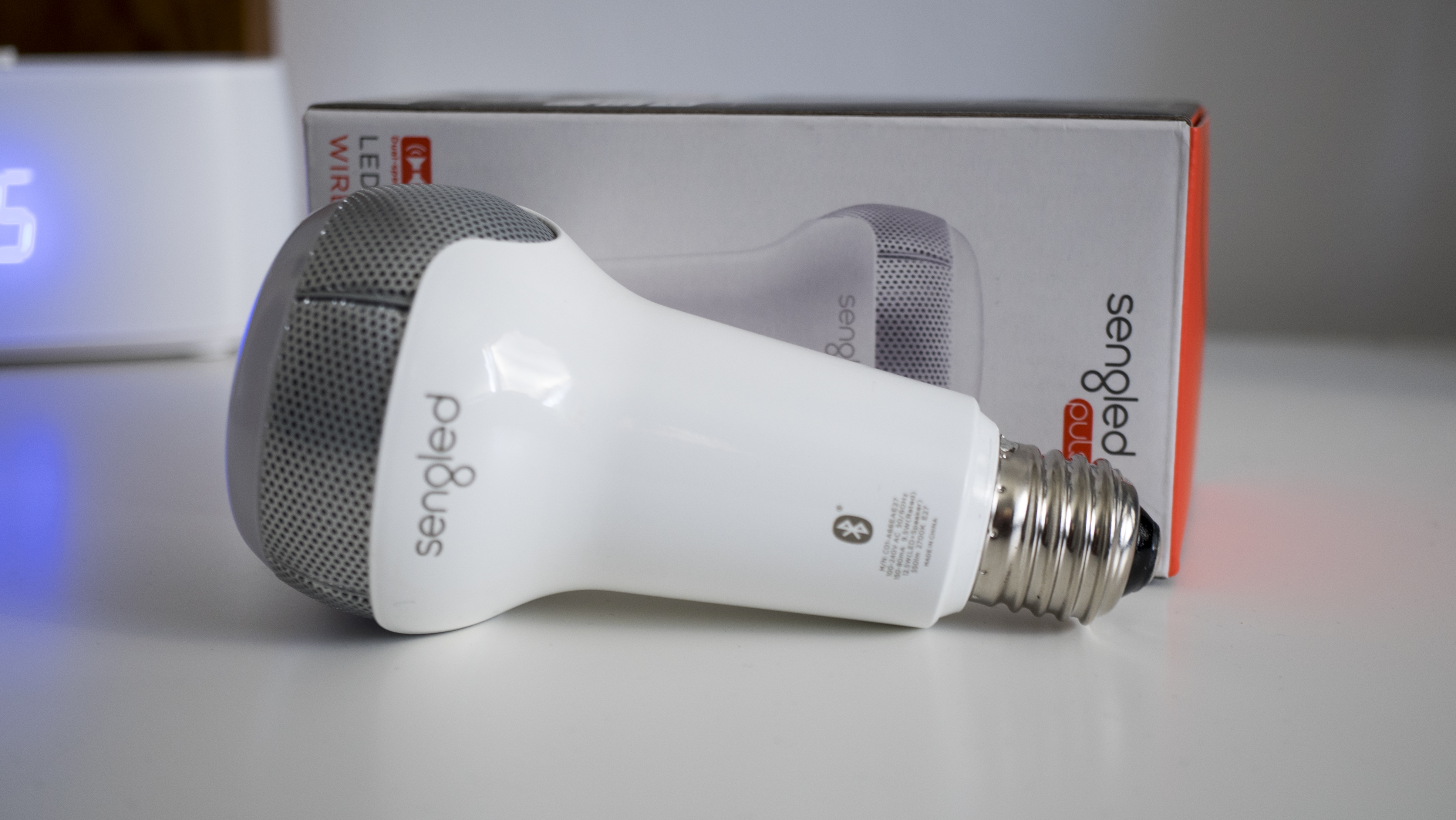 The majority of the bulb is made from a matte white plastic with exception to the metal grill of the speaker. The top of the bulb where the light shines out is made from clear plastic. The light that shines is of a dim yellow colour and there is no colour changing here. The bulb shines at 550 lumens at a 105-degree angle which means it’s bright, but because of the angle it will not fill a room if installed in a lamp. Think more mood lighting here.